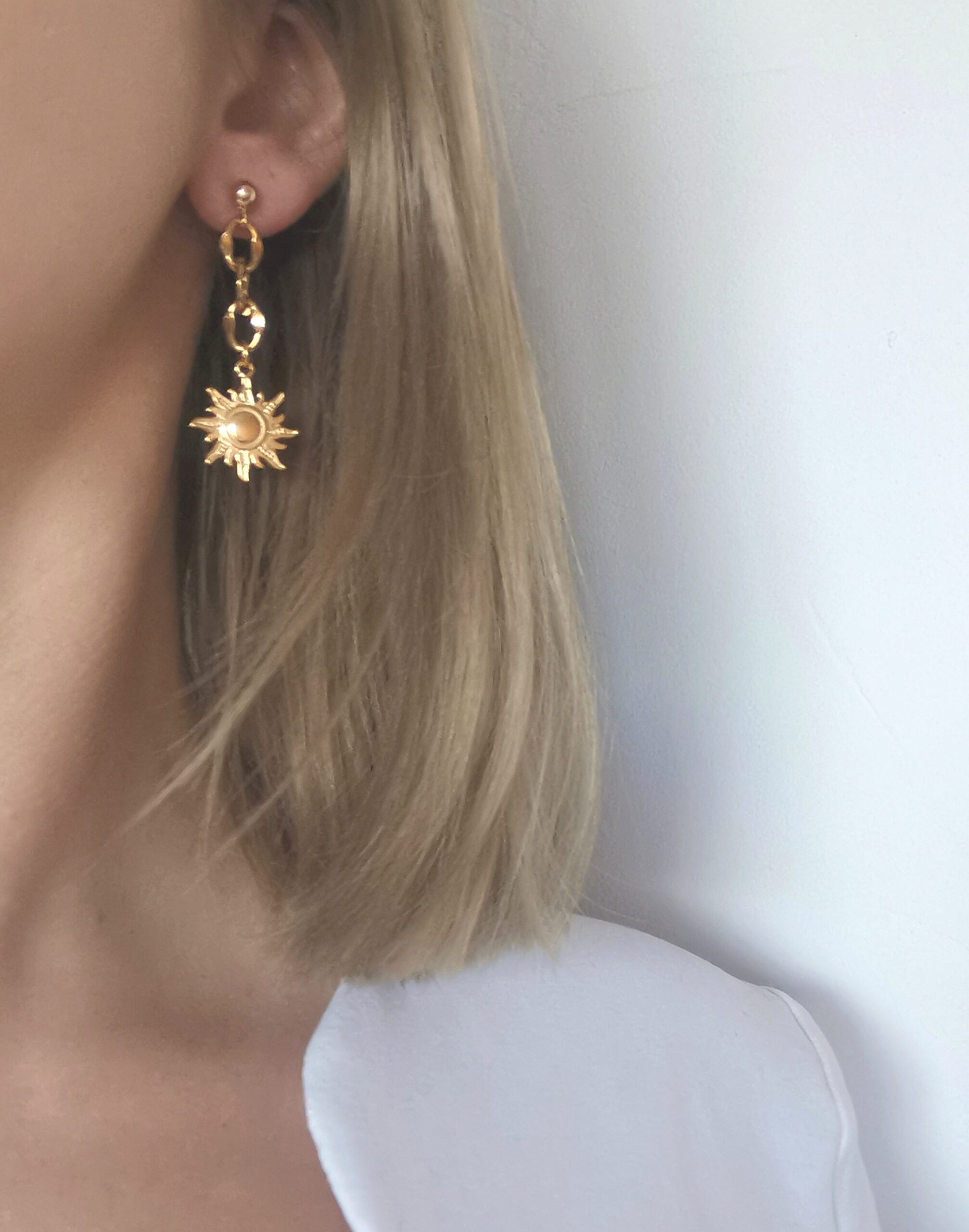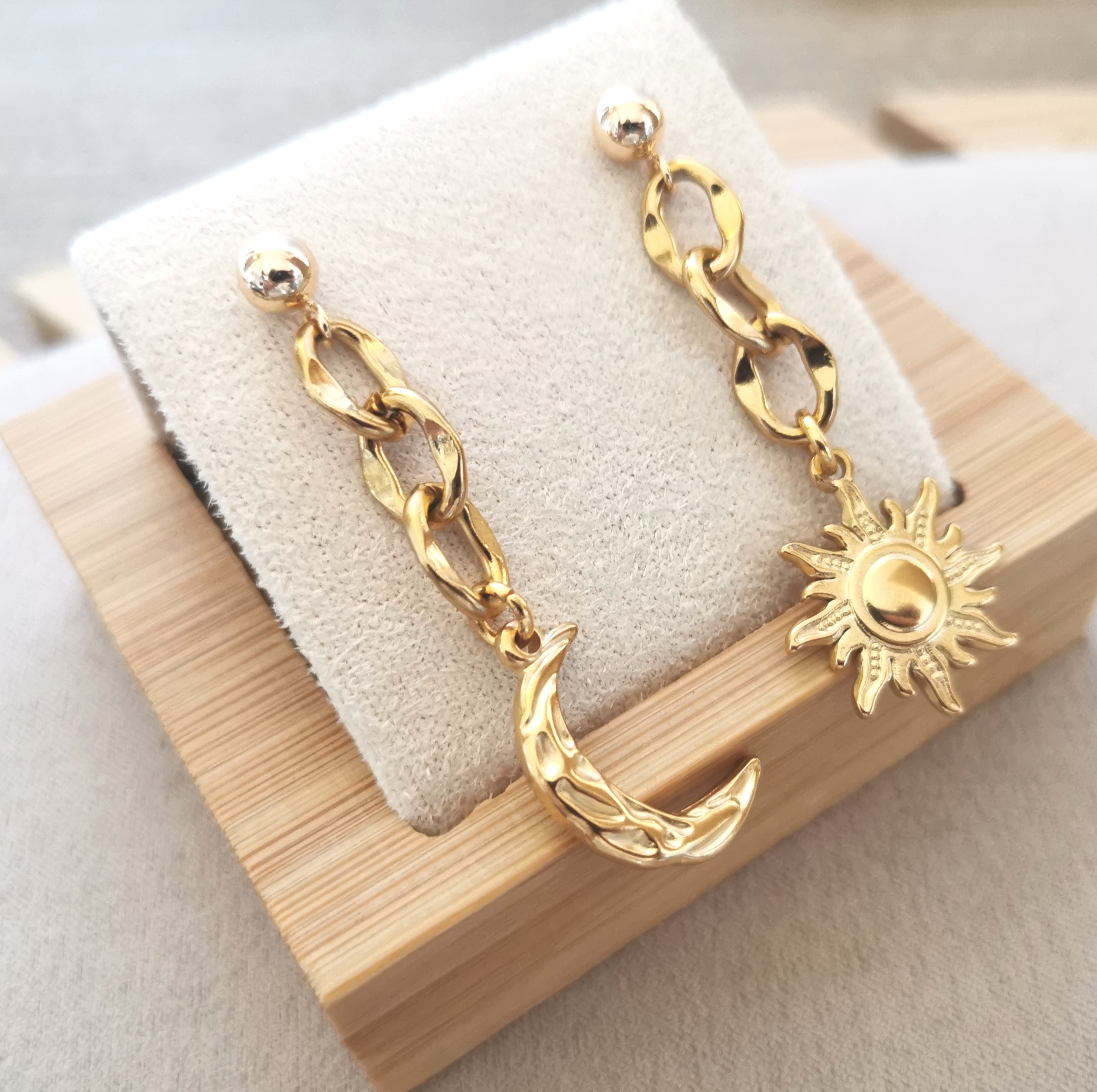 Boucles d’oreilles « Astres ». Clous d’oreilles plaqués or, et maillons et pendentifs (une lune sur une boucle et un soleil sur l’autre) en acier inoxydable.