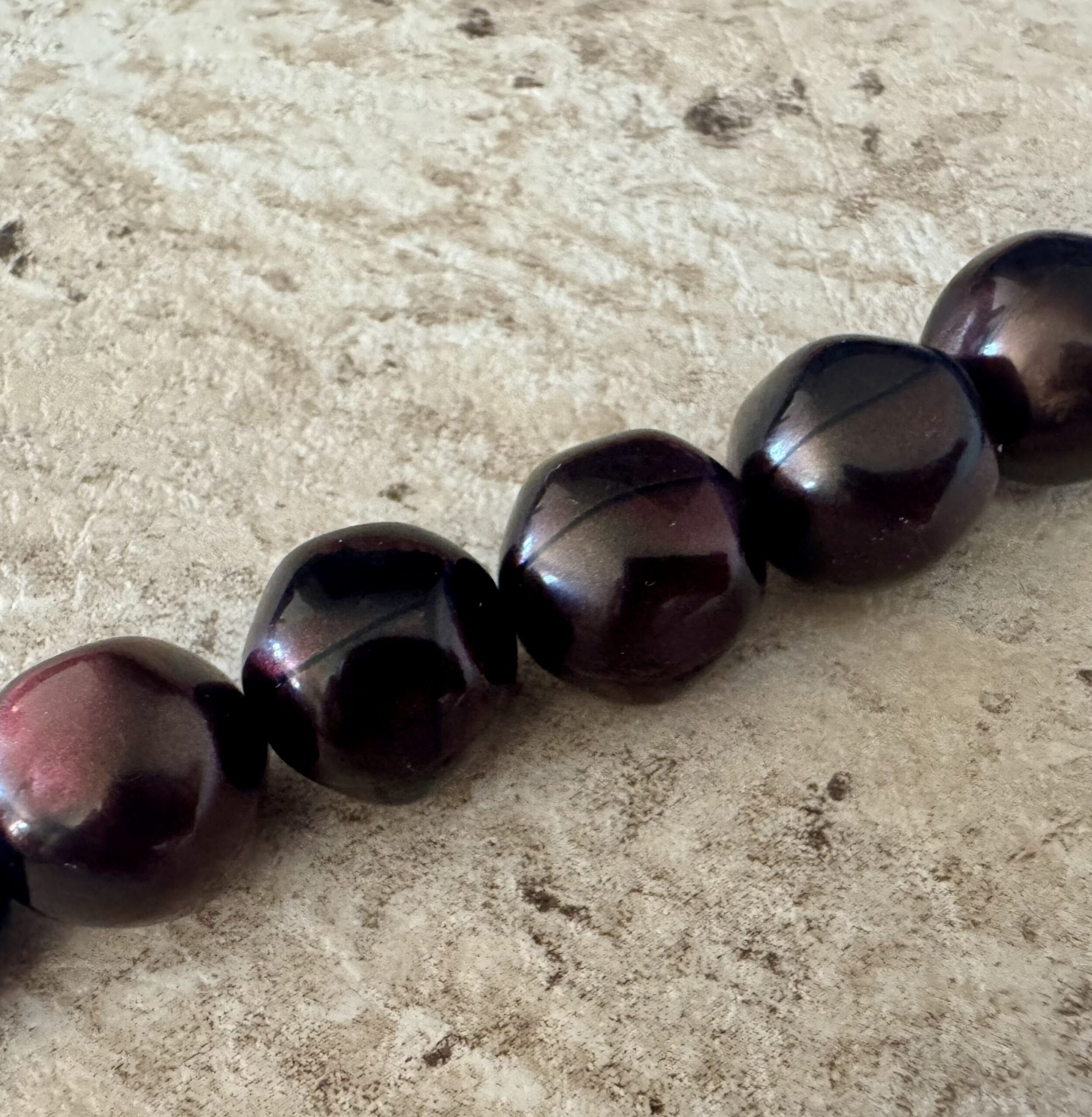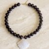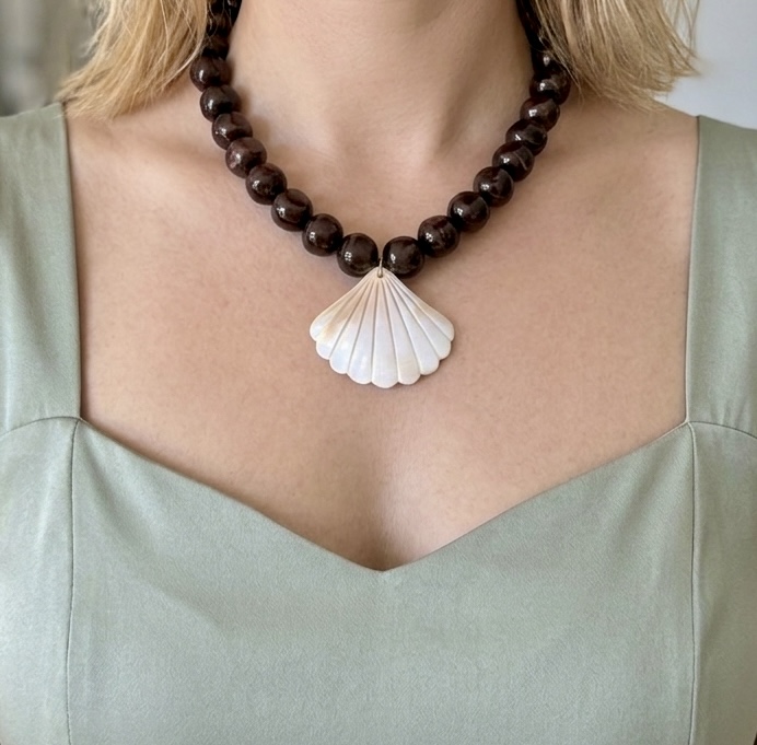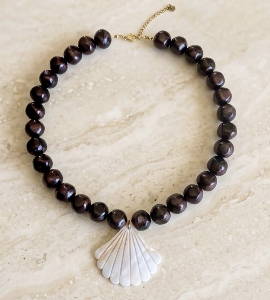 Perles en résine, coquillage de nacre et apprêts en acier inoxydable. Coloris brun impérial aux reflets pourpre.