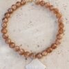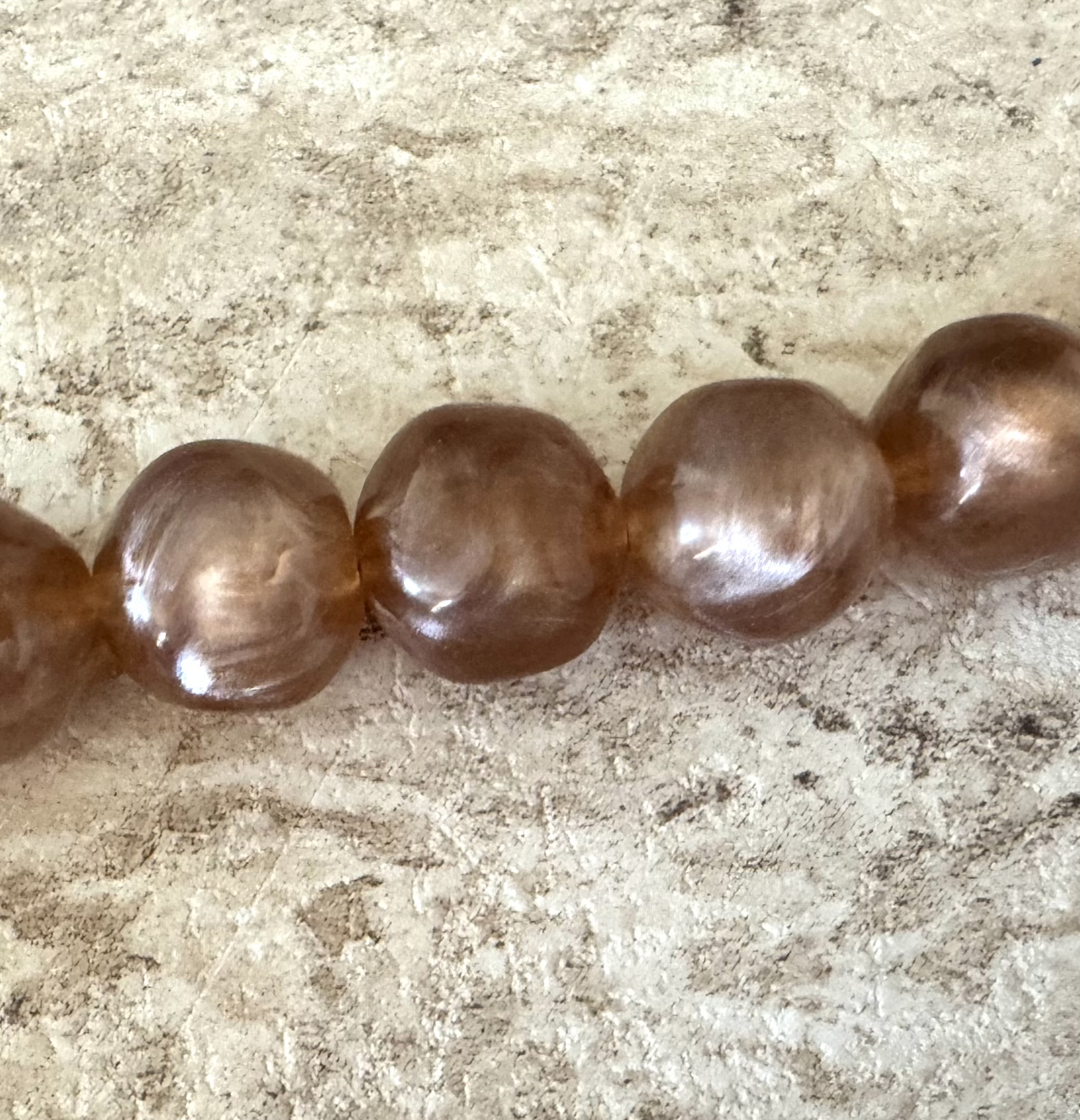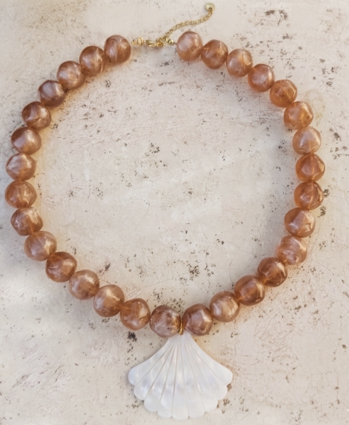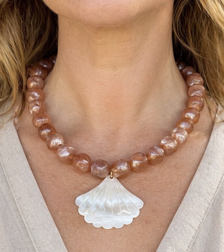 Perles en résine, coquillage de nacre et apprêts en acier inoxydable. Coloris marron glacé.