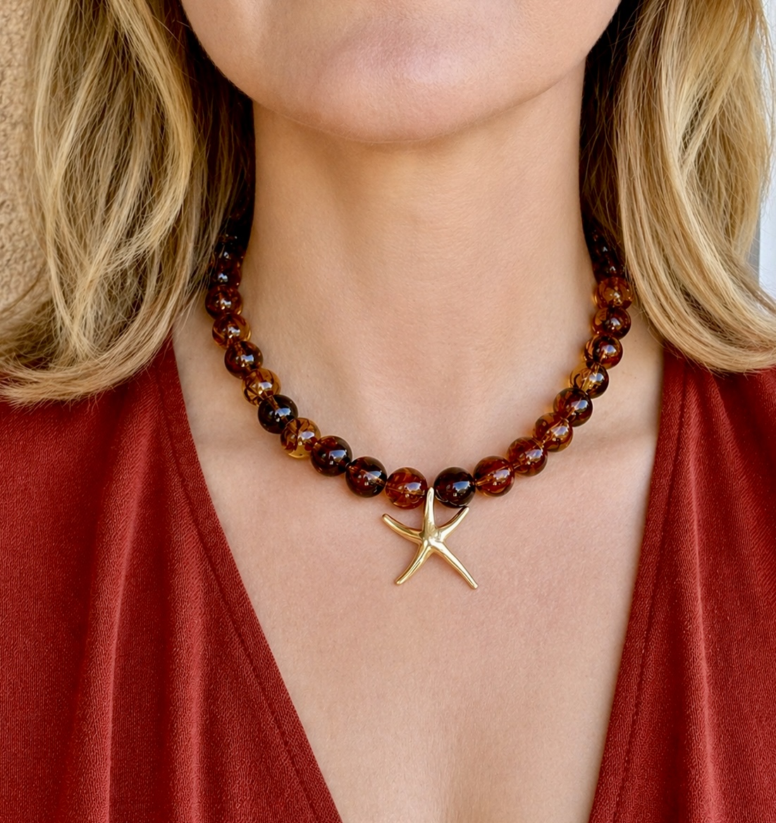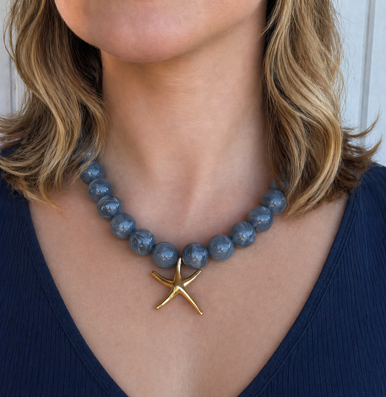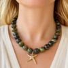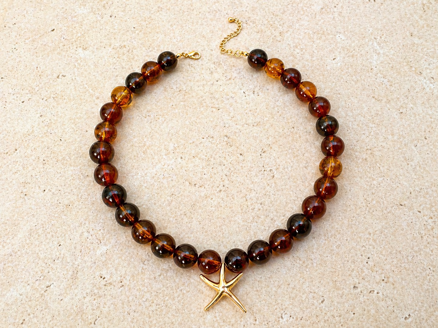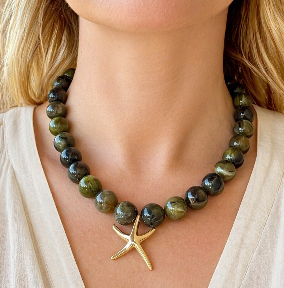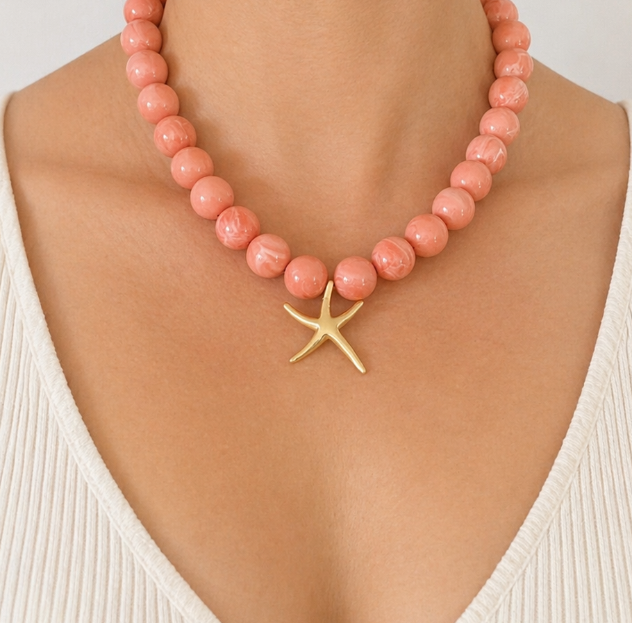 Perles rondes en résine, pendentif étoile de mer lisse et apprêts en acier inoxydable.