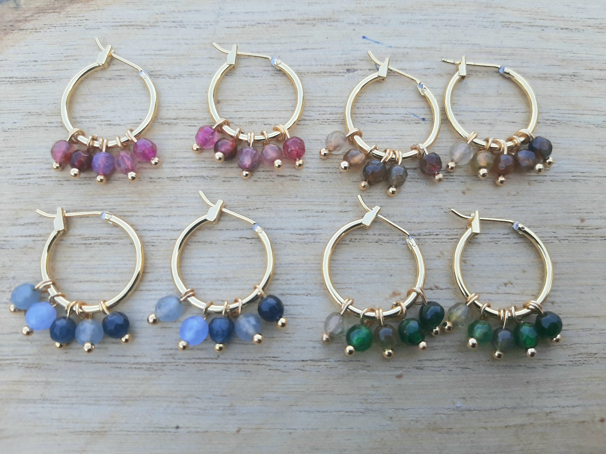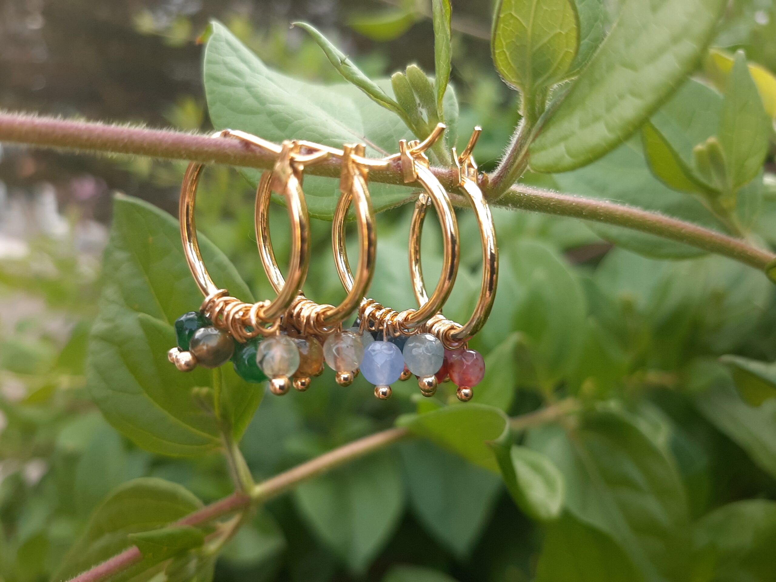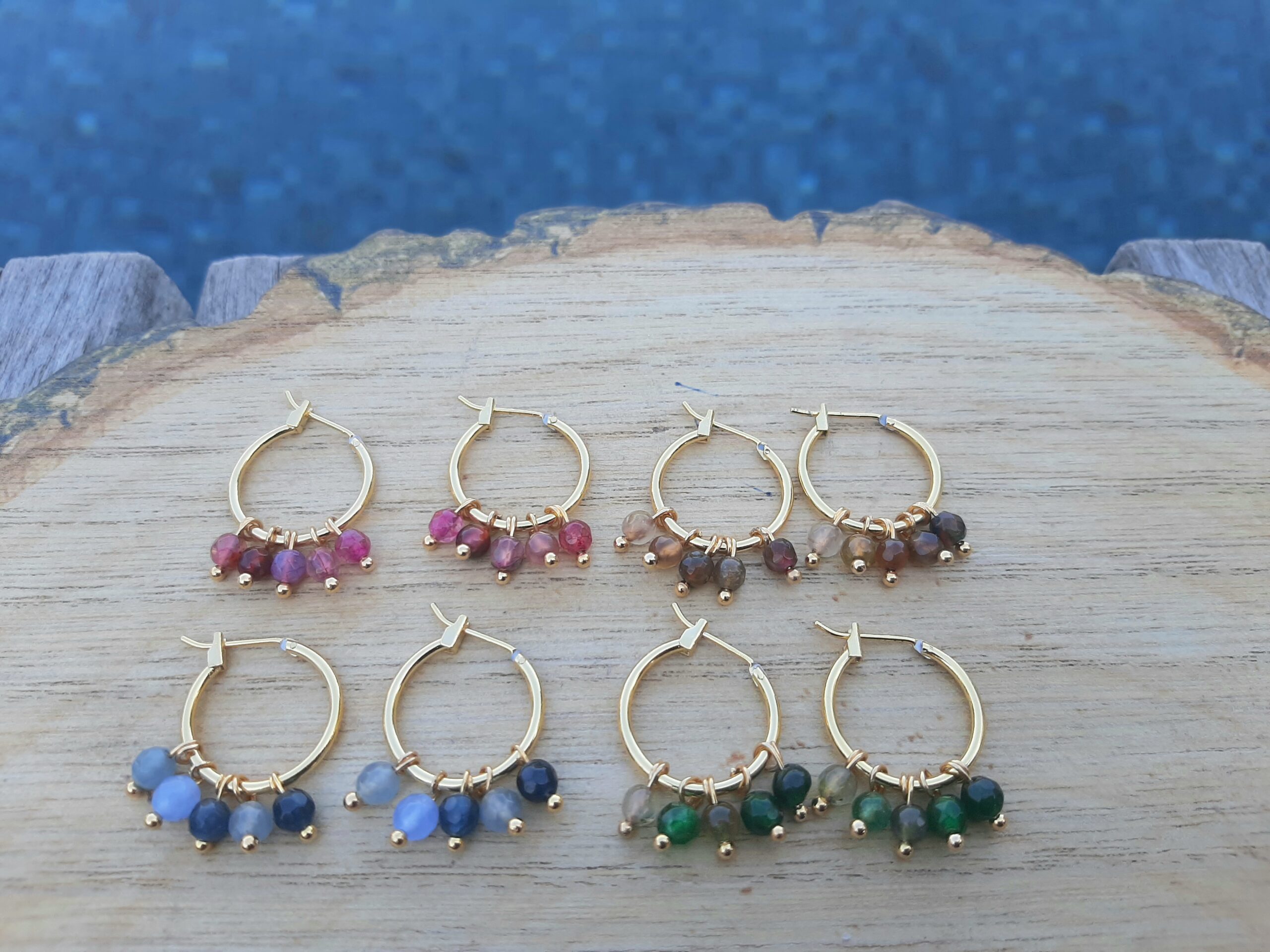 Petites créoles à gemmes dorées à l’or fin. Camaïeux de différents coloris.