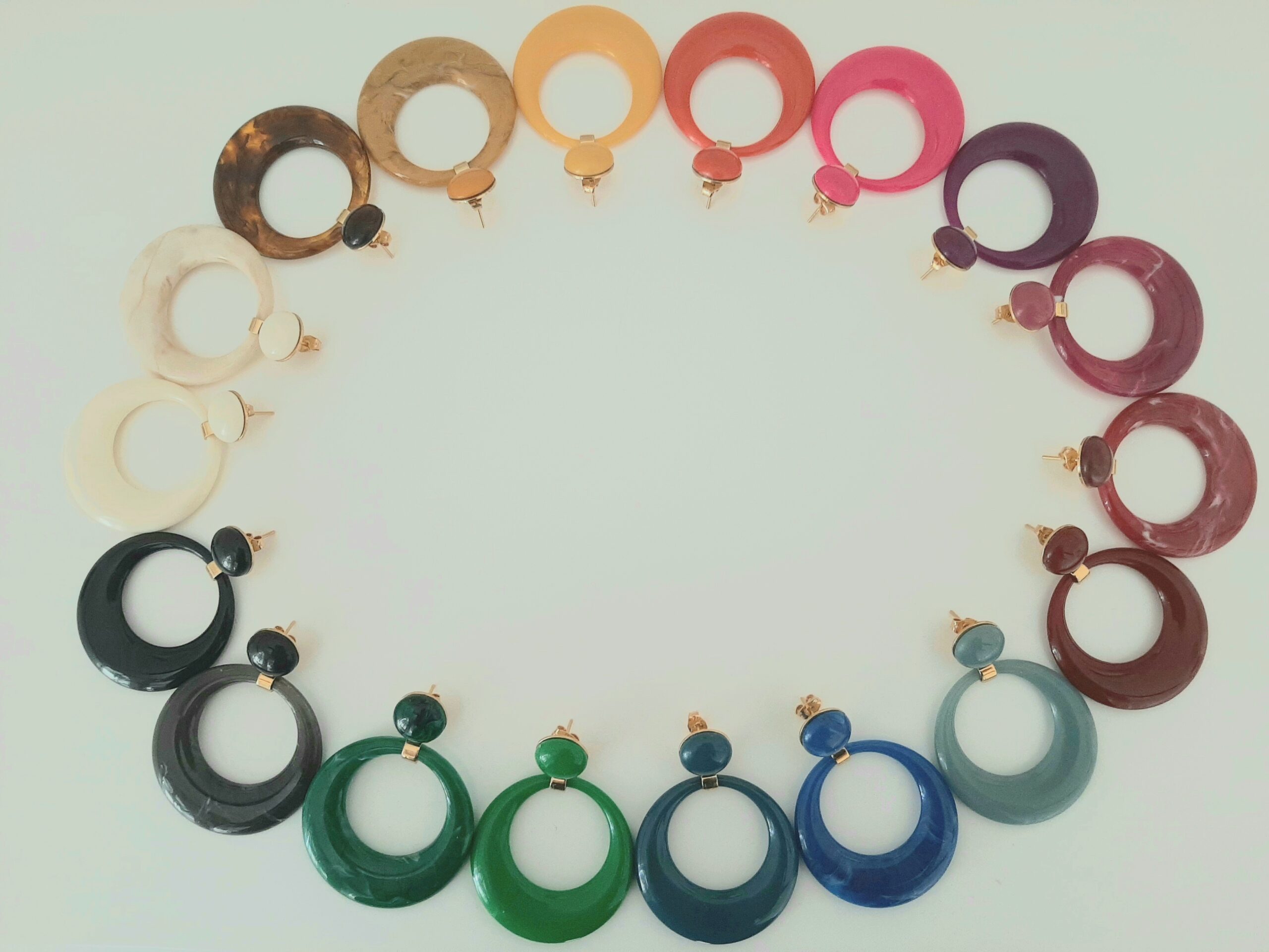 Boucles d’oreilles « Eliptica », style vintage. Pendentifs ovales et cabochons en résine et supports/ clous d’oreilles en laiton doré à l’or fin.