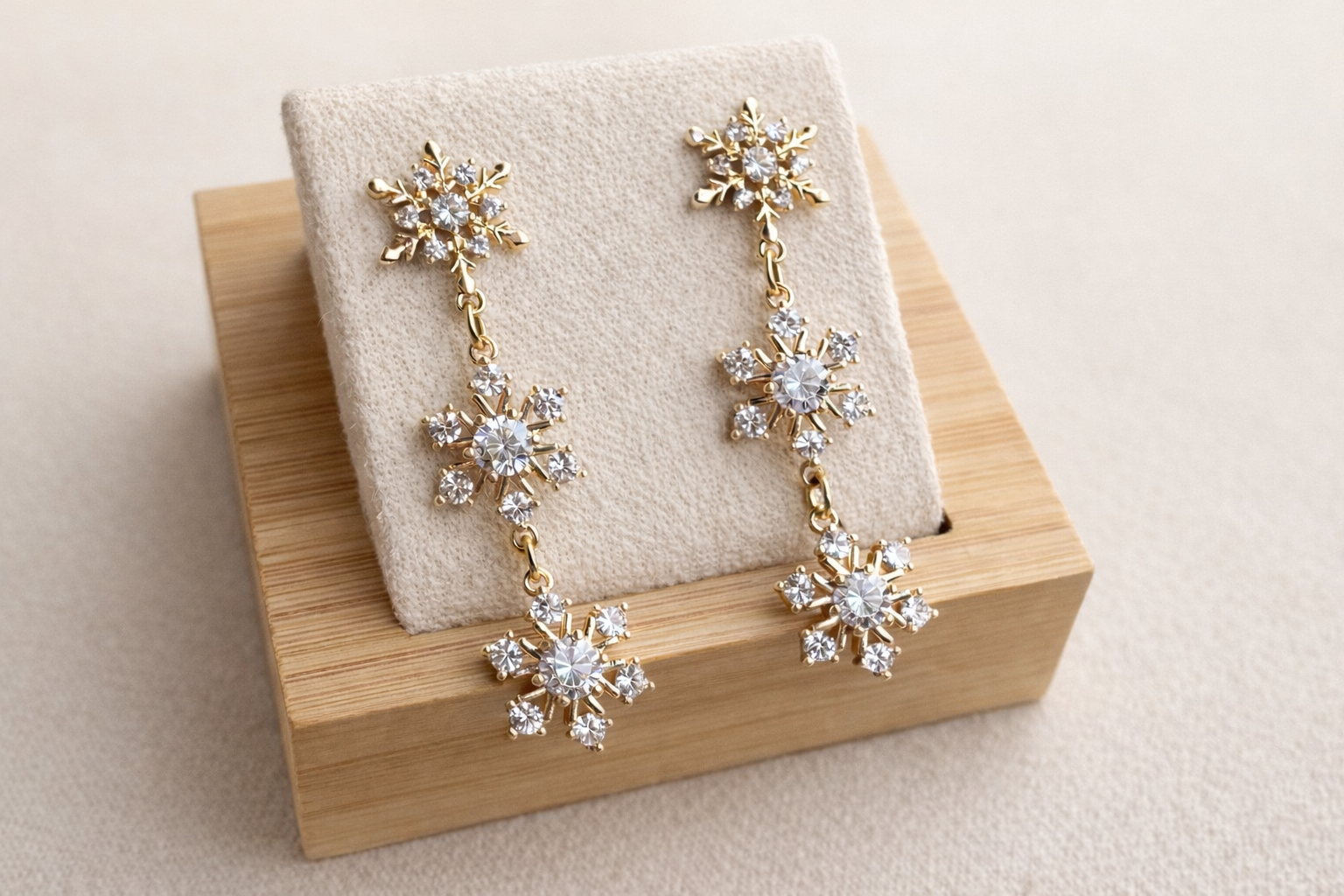 Boucles d’oreilles « Elsa ». Apprêts dorés à l’or fin et jolis flocons strassés.