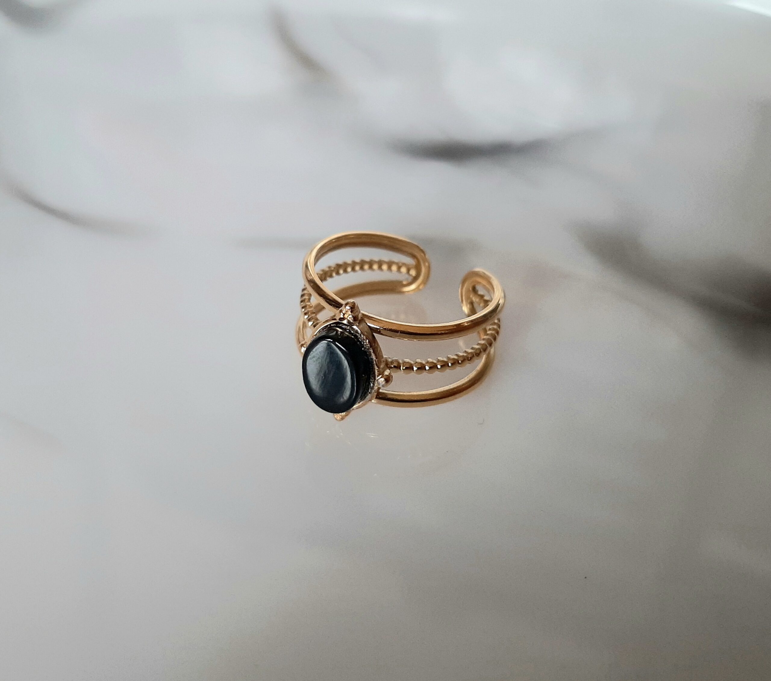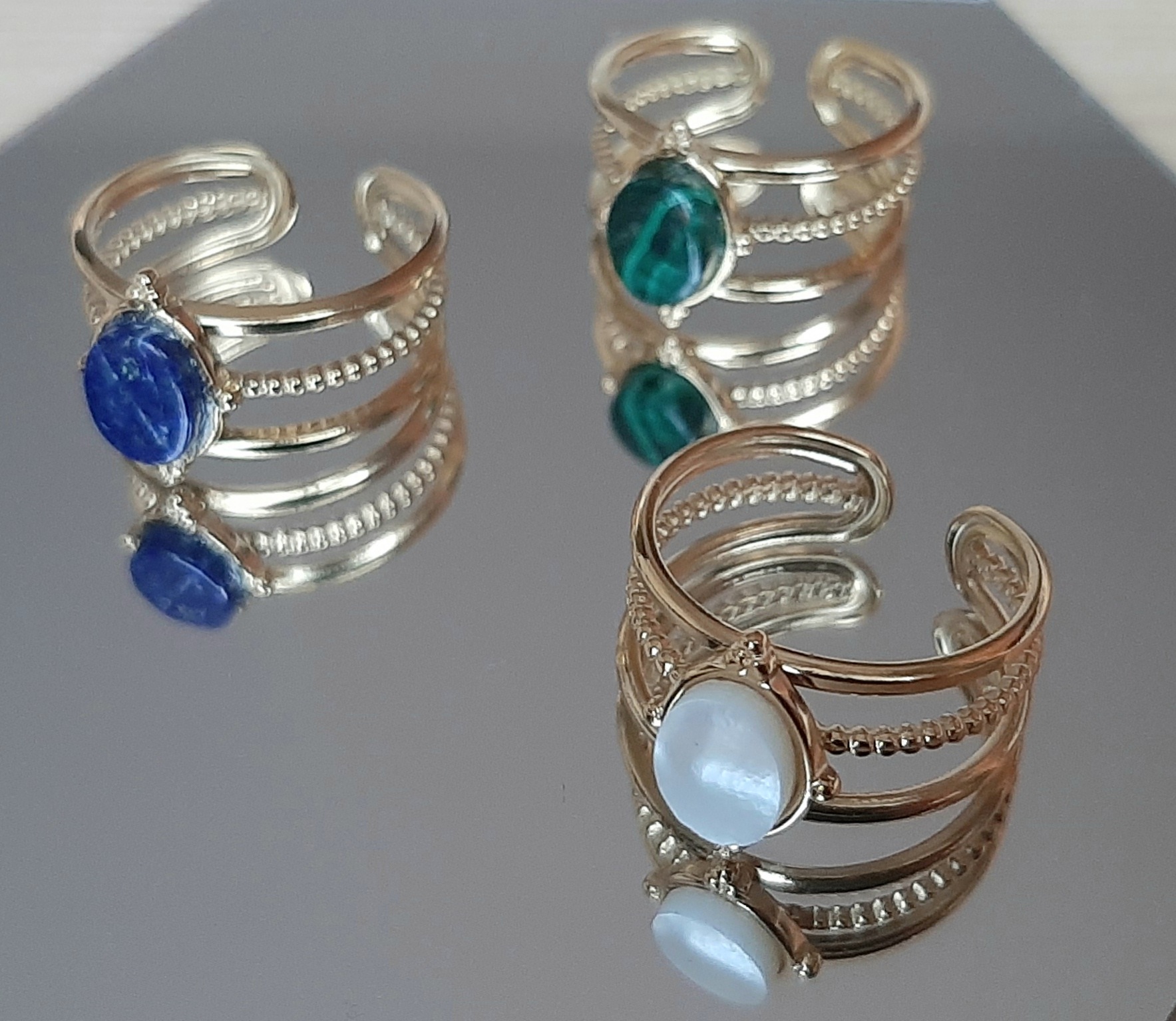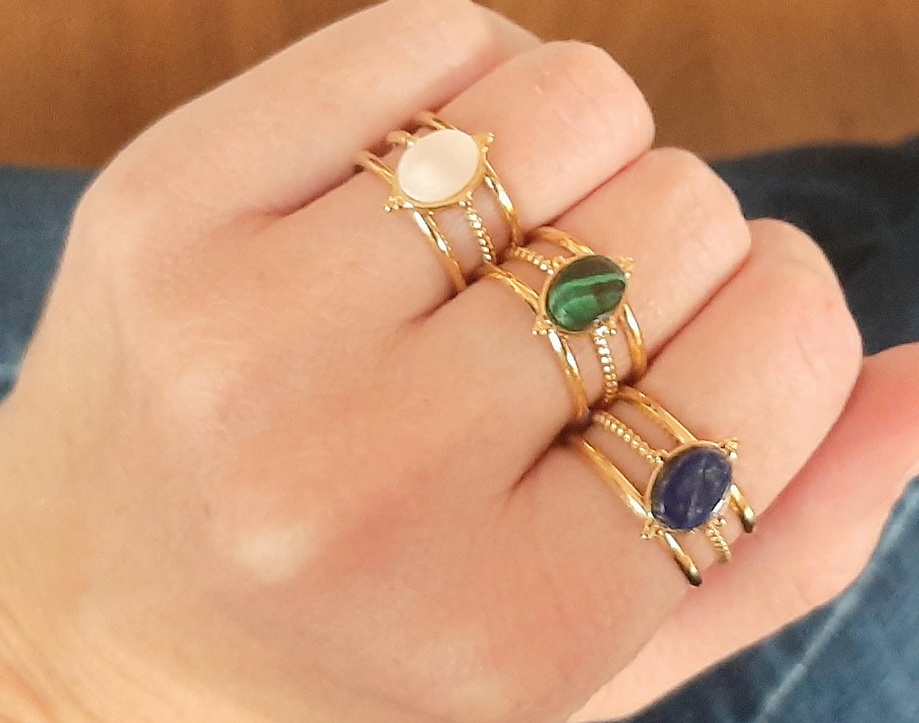 Bagues « Margot » dorées à l’or fin. Cabochons ovales de pierres véritables (malachite, lapis lazuli ou nacre naturelle).