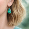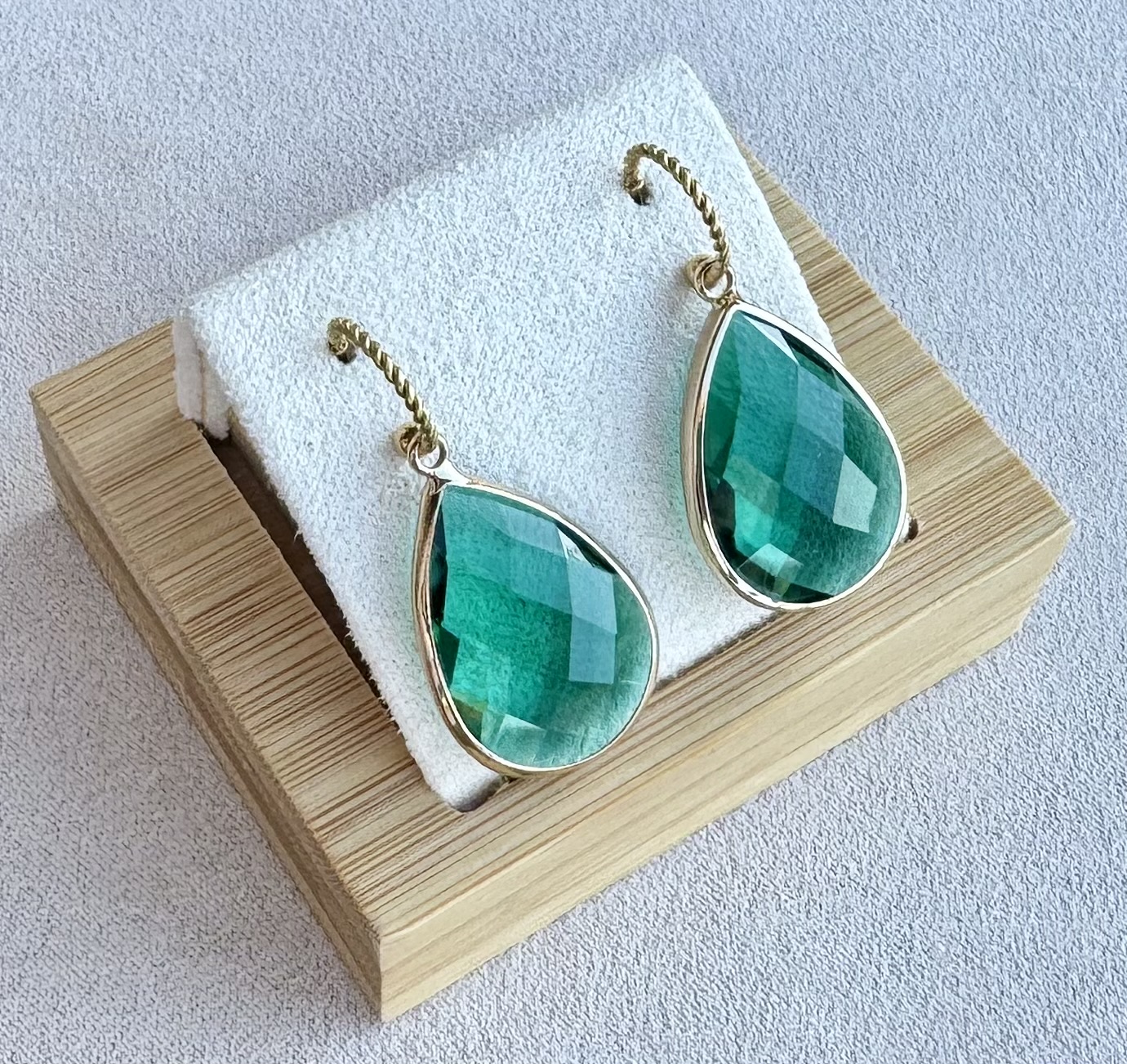 Boucles d’oreilles « Moïra », en verre et acier inoxydable doré. Montées sur demi-créoles torsadées en acier inoxydable. Coloris vert.