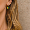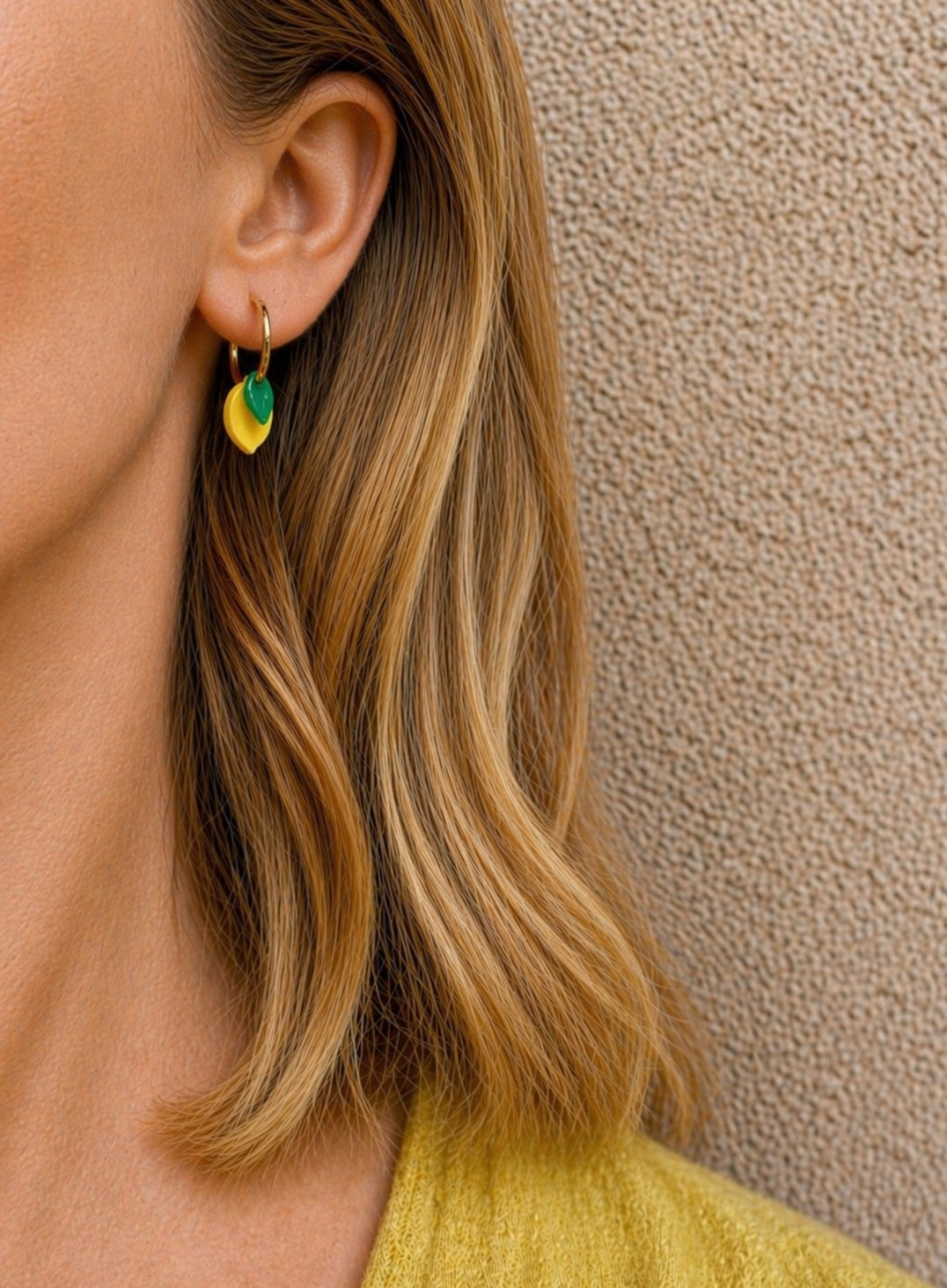 Boucles d’oreilles « Nilsa ». Citrons en acrylique et créoles en laiton doré à l’or fin.